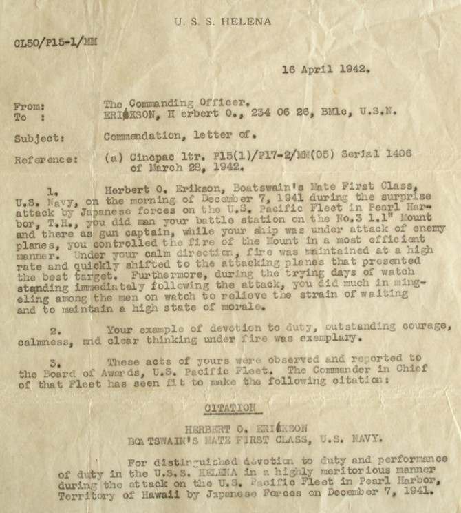 Adam R Posted December 7, 2013 #46 Posted December 7, 2013 That WWII era medals that are part of a larger grouping to a Boatswain’s Mate 1c on the USS Helena during the attack. He received a Letter of Commendation for his services as gun captain of a 1.1” mount. The LoC later became the Commendation Ribbon, which later became the Commendation Ribbon with Metal Pendant. The GCM is hand engraved with his name and is dated 1937. The grouping also includes his post-war medals, CSC book (which unfortunately doesn’t specifically mention the attack), numerous photos and papers. Also with it is his original helmet liner, which he has personalized with details of the attack.