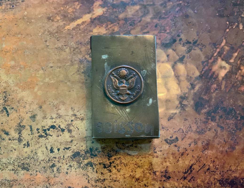 Cobra 6 Actual Posted August 28, 2021 #107 Posted August 28, 2021 Let’s shift back to WWI: in July 1918 US forces including the 1st Infantry Division, the 2nd Infantry Division, and the 6th Marines engaged in what became known as the Battle of Soisson. After heavy fighting the Allies emerged victorious. This “trench lighter” commemorates that battle: There are several things of note about this lighter: 1) It’s not really a lighter at all, but a matchbox holder, 2) Unlike most trench lighters this item was most probably actually made in the trenches, and somewhat crudely as a result, 3) The reversed letter “N” was not considered such a big deal back then and many American troops were only semi-literate, and 4) It appears that the central design element is a simple US Army uniform button that has been soldered onto the matchbox.