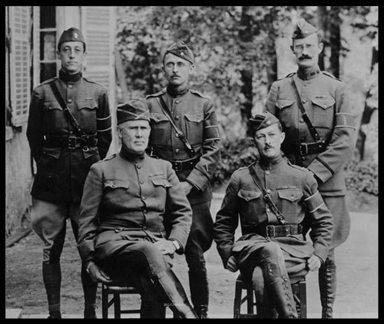 world war I nerd Posted June 1, 2014 Author #32 Posted June 1, 2014 General Staff Trench Clips Because the brightly colored General Staff Brassards were so conspicuous, the AEF issued miniature replicas of the various brassards in the form of a 1 inch wide by 4 inch long Trench Clip. The spring-backed Trench Clip was to be worn instead of the full sized brassard on the front of the service coat or overcoat, between the second and third button while in the front line trenches. Photo No. 79: The red, white and blue GHQ General Staff and the red and white Army General Staff Trench Clips are pictured above the solid blue Division Artillery Staff Trench Clip. The clips have been embroidered with miniature General Staff Corps and Field Artillery insignia respectively. Men such as General Pershing and future Army Chief of Staff, George C. Marshal or the men who worked for them at GHQ were all likely candidates to wear a General Staff Trench Clip whenever they visited the front. Note that Colonel Marshal is wearing an unknown dark colored brassard on his left arm.
