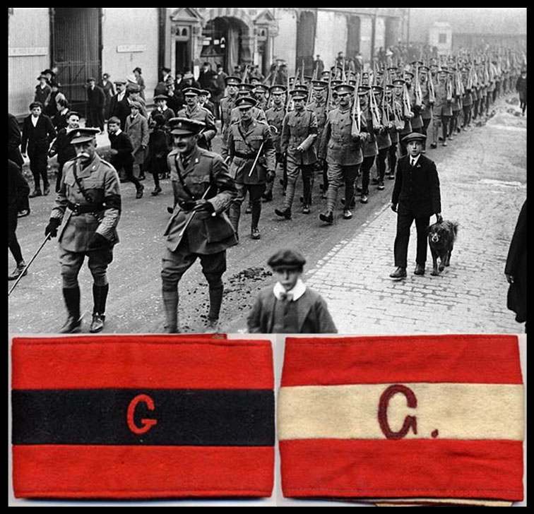 world war I nerd Posted June 1, 2014 Author #36 Posted June 1, 2014 British Army General Staff Armbands It would be foolish to think that British Army General Staff Armbands were not worn by members of the AEF; especially when you consider the fact that eight AEF divisions were either temporarily or permanently detached for service with the British 3rd Army during 1918. Photo No. 83: The upper photo shows and entire British regiment wearing an unknown armband. Underneath from left to right is the red, black and red British General Staff Armband for the HQ staff of an Army and the red, white and red armband for the HQ staff of an Army Corps. A red, white and blue armband was utilized by the HQ staff of GHQ, and a red armband was worn by the HQ staff of a division. The letter ‘G’ embroidered on each armband represented the General Staff.