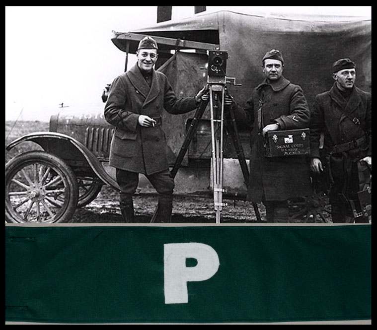world war I nerd Posted June 1, 2014 Author #45 Posted June 1, 2014 Accredited Photographer Brassard The same General Order that described the correspondent brassards did the same for the Accredited Photographer Brassard: 5. Accredited Photographers will wear the same uniform as accredited correspondents except that the brassard will be blue, with white letter “P”. AEF General order, number and date unknown Photo No. 92: In the absence of any authentic WW I photographs, I’ve included this photo of an official Signal Corps photography section, and a reproduction of a WW II Photographer’s Brassard, which despite the fact that it’s made from green material rather than blue, it’s still a reasonable representation of what a WW I brassard would have looked like, so long as you remember that the background should be blue!