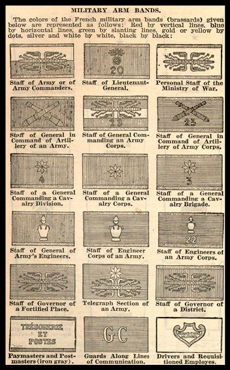 world war I nerd Posted June 1, 2014 Author #33 Posted June 1, 2014 French Army General Staff Brassards During the course of the war, certain AEF units, most notably elements of the 4th Marine Brigade and the 93rd Infantry Division were seconded to the French Army for various operations. Due to this fact, certain AEF organizations placed under the control of the French Army utilized French Army General Staff Brassards while conducting their business. This practice made perfect sense because the French Piolus adjacent to the Doughboys and Leathernecks would instantly recognize the authority that a brassard borrowed from their own Army represented. Photo No. 80: A number of French Army brassards were identified in this page scanned from a pamphlet published in 1917 that was handed out to American soldiers before they shipped out for France.