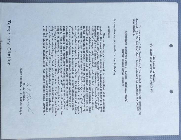 KASTAUFFER Posted March 6, 2015 #1 Posted March 6, 2015 I acquired this at the Show of Shows last week from a dealer who bought it from the Nephew of the veteran. It caught my attention as soon as I saw it, especially the Bronze Star certificate. He was a Surgeon and the CO of the 5th Medical Bn , attached to the 5th Marine Division. The 5th Med Bn saved a lot of lives on IWO. The documents and photos do a great job of telling his story. Iwo Jima was the only battle be participated in during the war, however the impact of being there stayed with him for the rest of his life. You can really see it in his face when you look at the photos of him taken on Iwo.
