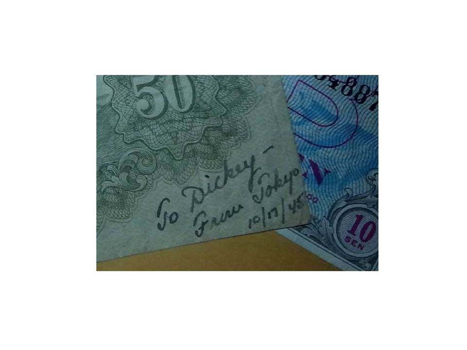 tarbridge Posted May 24, 2016 #11 Posted May 24, 2016 Among the items he gave me are a pair of small U.S. flags, each mounted to a wooden dowel. Also, a pretty mean looking machete he picked up in the Philippines. I think that the coolest items are the U.S. issued currency for occupied Japan he kept. One currency note is actually an old Japanese one, which my Uncle mailed back to the U.S. - to my father - during his time in occupied Japan immediately after the war's end. Uncle Bill inscribed on the corner of the note: "To Dickey - From Tokyo 10/17/45" (My father's name is Richard - "Dickey" when he was a kid) Finally a letter my father wrote to Uncle Bill shortly after the war (my father was 9 years old at the time). My Uncle Bill kept this and passed it on to me when he gave me his other items. The letter is dated 11'25/45 and reads: "Hi Admiral!! When are you comeing to visit me? By the way, how are you? If you see Tojo will you please put a tack {a big one} on his chair? If you do, you will be doing me a big favor!! Thank you for the Japanese money. I just wrote a letter to Granpa and Grandma. I haven't much to say, well goodby. Love from Dickie xxxxxxxxxxxxxxxxxxxx" The letter is priceless....