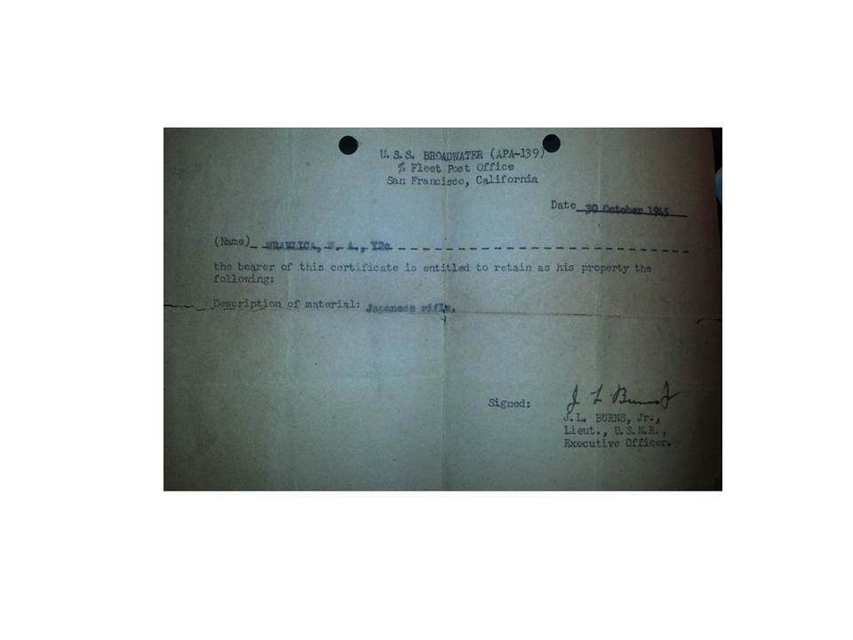 bryang Posted May 24, 2016 #1 Posted May 24, 2016 My Uncle Bill served aboard the USS Broadwater - an amphibious landing ship - in the Pacific during the Second World War. As a kid, he used to let me play with the Japanese rifle he brought home. When I was about 15 years old he gave me his uniforms and other items from the war. This included two Navy jumpers with insignia, as well as the cap and a dark blue neck kerchief. Each item has his name stenciled on them. Uncle Bill gave me the rifle he brought home. He later found and gave me the document, signed by his Commanding Officer, authorizing him to bring the rifle home.