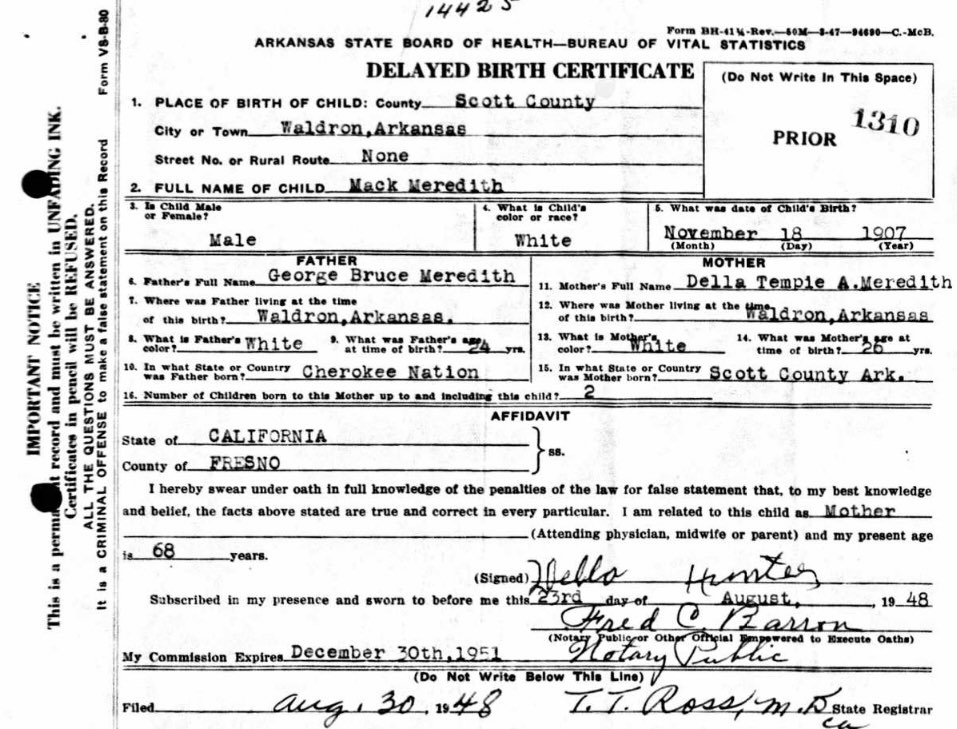 Deuce Posted February 4, 2023 Author #18 Posted February 4, 2023 Since this thread has has been extremely helpful in breaking through some walls I was unable to, the next couple posts will cover a few Soldiers that I do not have a ton of information on. Next up is Mack Meredith. The information I have collected on him is pretty sparse. I have it listed below: Name: Mack Meredith Birth: 18 November 1907 Birthplace: Hon, AR Service Number: UNK Rank: PFC Enlistment Date: 04 April 1944 Discharge Date: 17 November 1945 Death: 29 January 1987 - Oklahoma City, OK The only information that assisted me in identifying the individual above was the fact that Hon, AR is a small town in the middle of nowhere. I was unable to find a draft card but I did find a delayed birth certificate for a Mack Meredith born in Waldron, AR. Waldron is about a 10 minute drive from Hon. Two additional details that are interesting about the information I found. 1. Mack’s father was born in Cherokee Nation Territory. Mack may have been part Cherokee. Tying him to Charlie Tucson is also interesting as on Charlie Tucson’s DD Form 1330 in block five (Discharge Date) they wrote the words “HON”. I’m not sure if that is an acronym or if it is a location; Hon, AR. I know this information is a long shot but I enjoy the hypotheticals. 2. The delayed birth certificate was submitted by his mother in 1948 and the affidavit was signed in Fresno, California. Mack would have been 41 years old at this time! The mother also signed with a separate last name making me think she was divorced from Mack’s father at some point. All of the information above matches a grave marker in Oklahoma City for a Mack Meredith that served in the Army. on a separate note - if anyone has a copy of the 33rd Armored Regiment Unit History from 1945, I would love if you could help me verify these Soldiers were in the organization. I’ve had luck matching home addresses and putting names to faces by using a unit history of the 13th Infantry Regiment and I would love to try to do the same with these Soldiers!