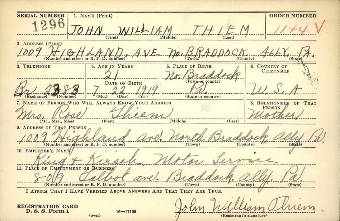 Deuce Posted February 2, 2023 Author #8 Posted February 2, 2023 Next up is John W Thiem from North Braddock, Pennsylvania. Surprisingly, John also had a decent amount of information available and the NARA was able to return at least one document that was not destroyed by the fire. It didn’t help much in identifying his unit but it did give his rank. The information that I’ve collected on him is listed below: Name: John W(illiam) Thiem Birth: 22 July 1919 Birthplace: North Braddock, PA Service Number: 33 030 323 Rank: SGT Enlistment Date: 17 January 1941 Discharge Date: 17 September 1945 Death: 2 June 1999 - Glendale, AZ I’m still working on their units but I feel like I will be able to find them eventually.