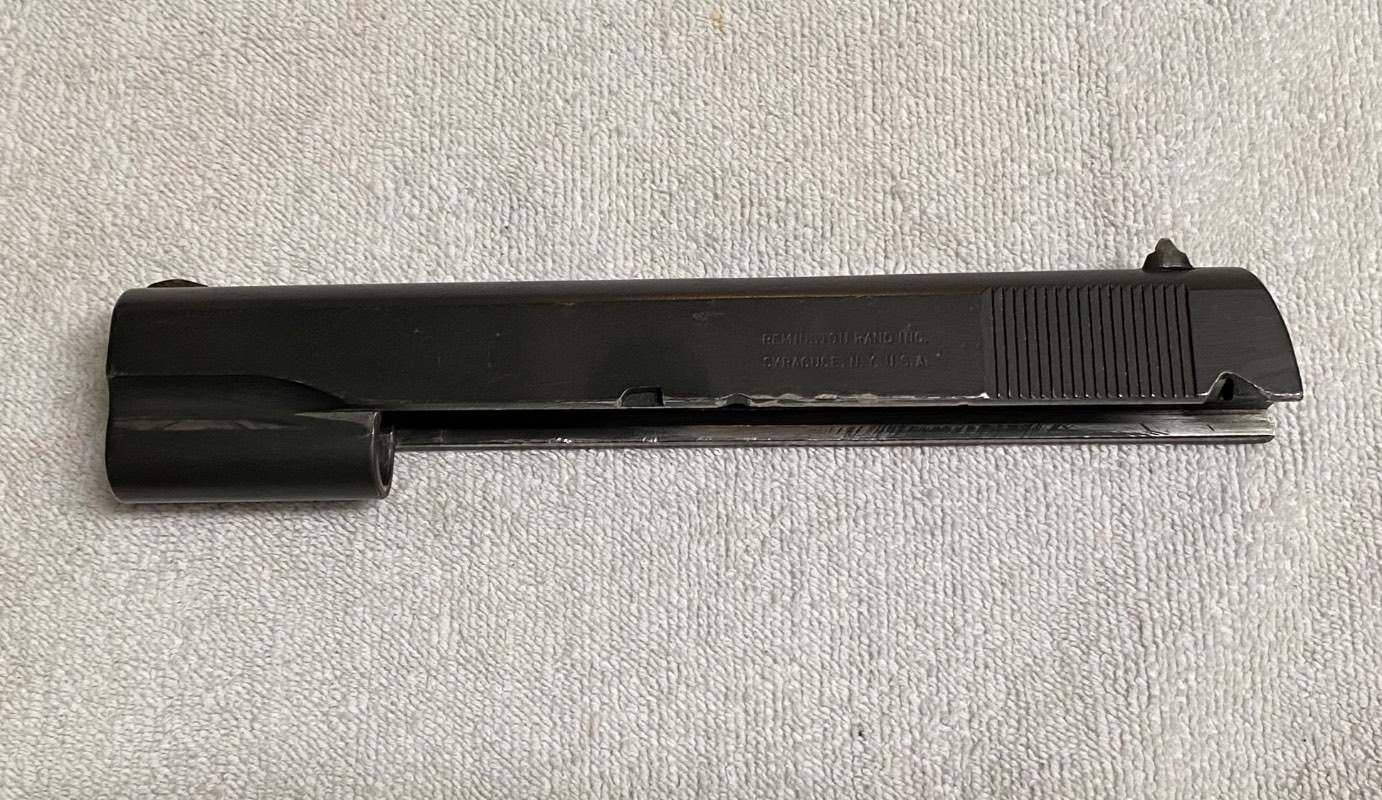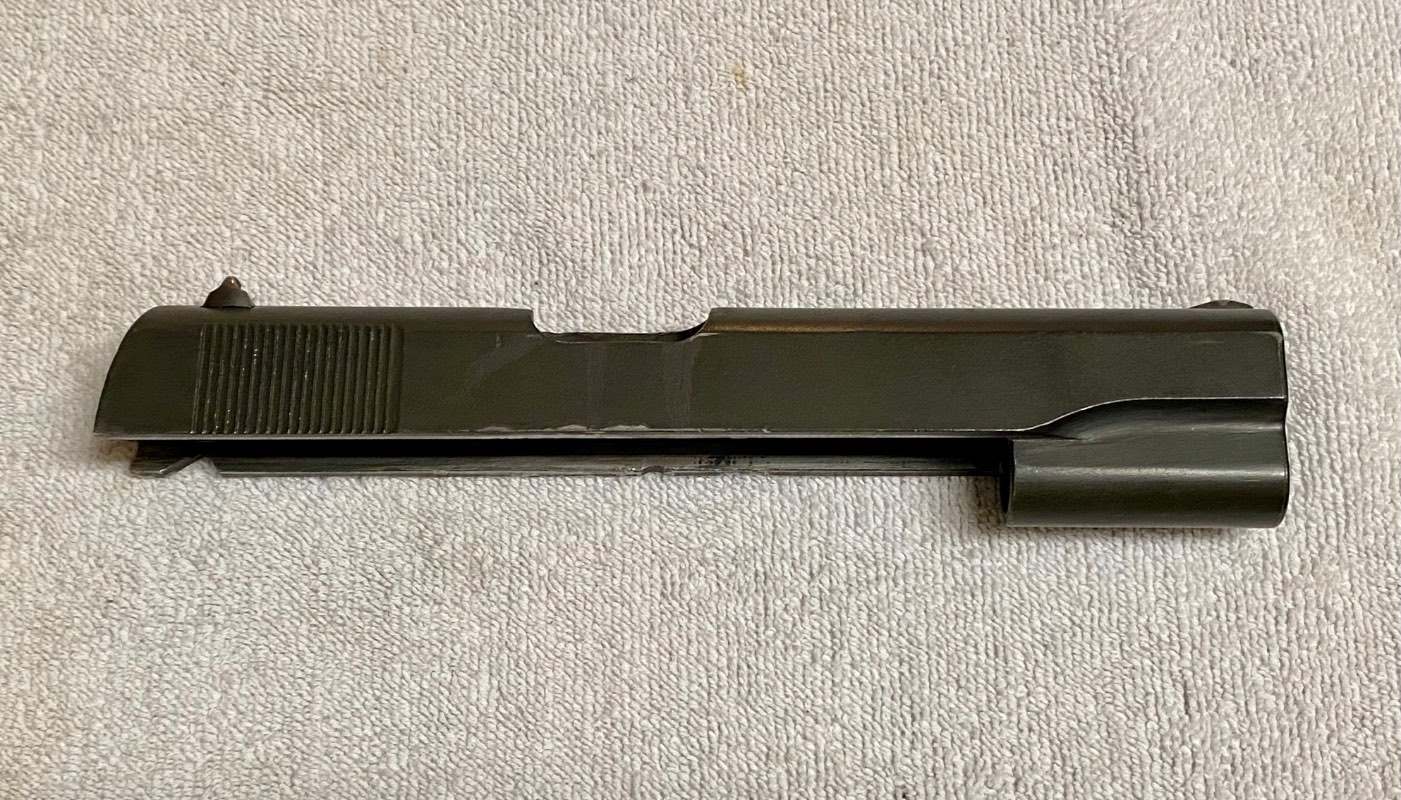 Rhscott Posted June 10, 2025 #2 Posted June 10, 2025 The extended trigger is not a GI part. The rest is GI or modified GI. The slide is a wartime Remington slide and it looks like the edges have been peened to tighten the slide/frame fit; not a pretty job either. Looks like 1950s-60s attempts to slick up GI parts for competition shooting.